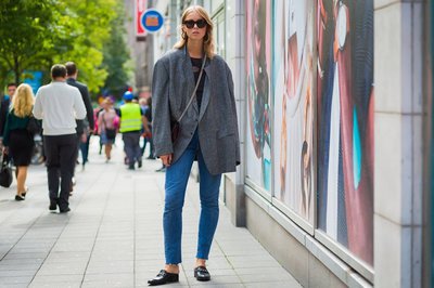 - С чем носить светлый пиджак днём? Джинсы прямые, белая футболка/рубашка, лоферы/кеды; вечером — шёлковое платье и босоножки.